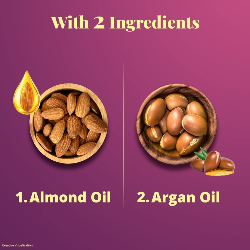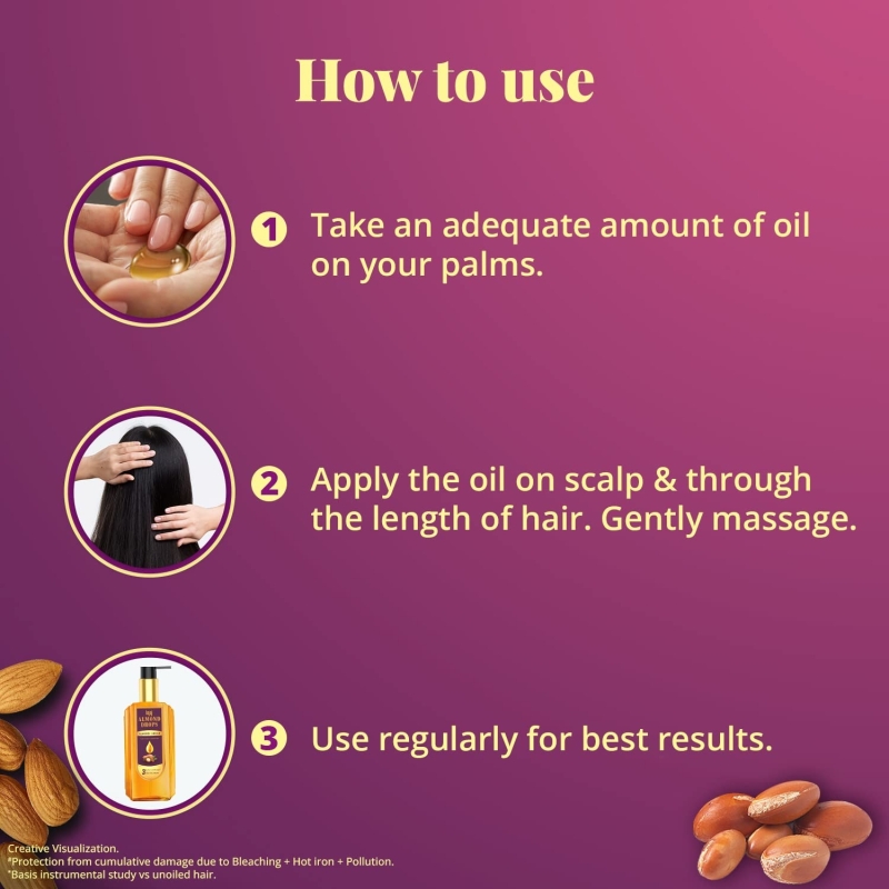 • Bajaj Almond Drops Almond + Argan oil protects the hair against cumulative damage from Chemical treatments, Heat styling and Pollution