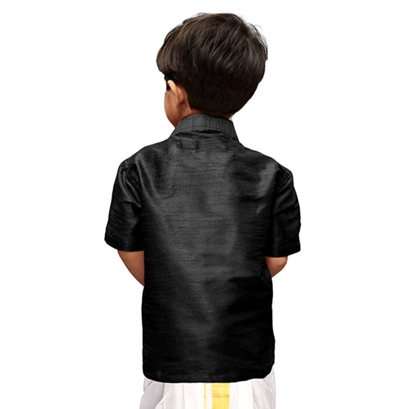 Its spread collar accentuates its sophisticated charm, while the regular fit highlights its timeless appeal. This ethnic shirt, has a button placket, half sleeves, patch pocket and curved hem. These are perfect accompaniments for a silk dhoti for traditional occasions and also on trousers for a formal, classy look. In souther part of the subcontinent these shirts are widely adorned boys boys and men as a traditional wear for any auspicious occasion.