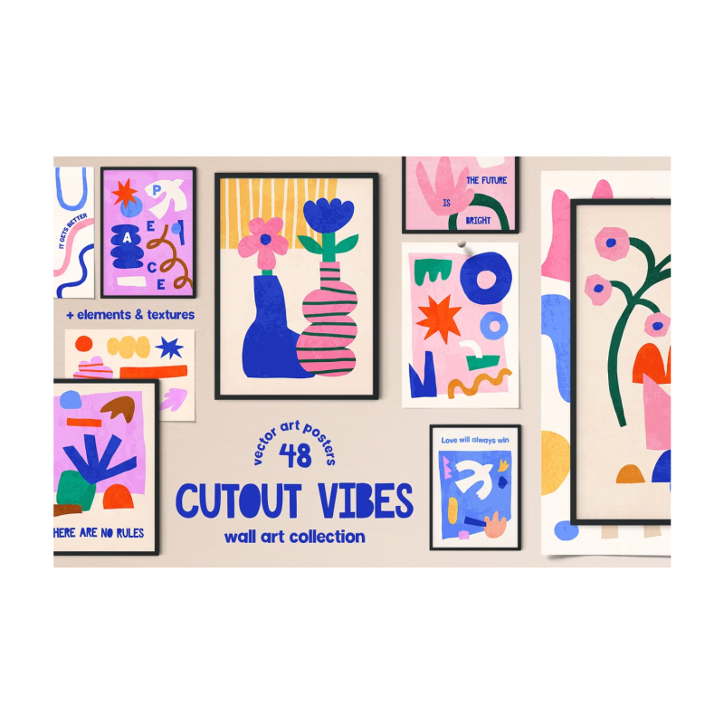 Cutout Vibes Collection includes 48 modern pre-made posters, 5 vector textures, and 392 elements for creating your unique design. You can resize and recolor all posters and elements in editable vector files.
